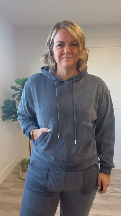 Cozy meets cool in the Azure Top, your new favorite long sleeve hoodie. Drenched in a rich indigo blue, it boasts a velvety feel and ribbed texture that’s as fun to touch as it is to wear. With a relaxed drop shoulder, banded cuffs and hem, plus a hood with adjustable drawstring, it’s designed for laid-back days. The kangaroo pocket adds a playful touch—perfect for stashing snacks or warming your hands on chilly afternoons. Slip into this snug top and let comfort take the lead in your style game.