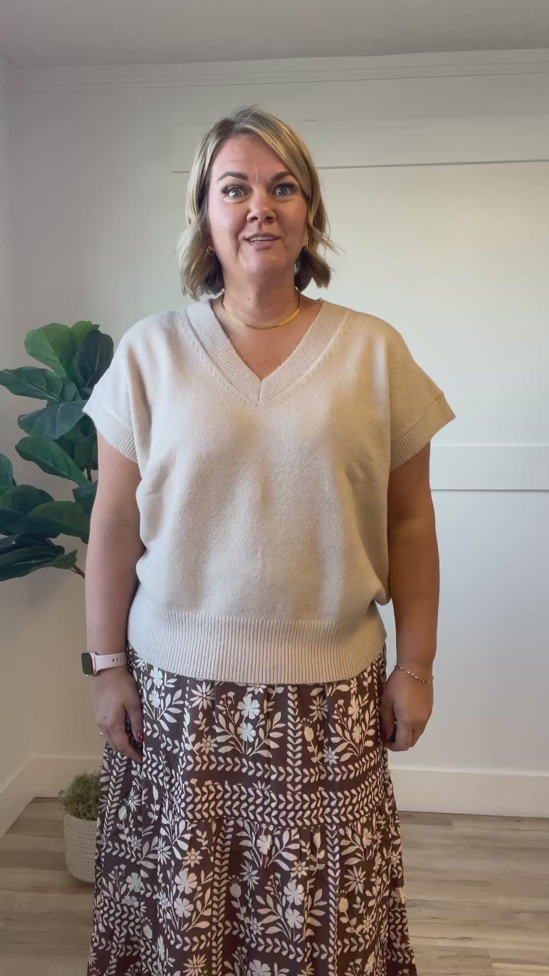 The Bria Sweater is a playful twist on a classic knit pullover. With its short cap sleeves and flattering V-neck, it can be worn as a cozy sweater or styled as a chic vest for layering. Perfect for adding a fun, versatile layer to your outfit!