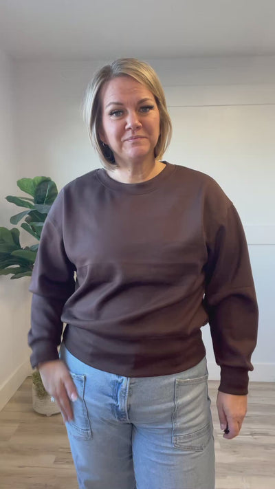 The Cozi Top in dark brown brings cozy vibes with a smooth scuba fabric that feels like a gentle hug. Its solid color and crewneck design create a classic look, while drop shoulders and seam detailing add a fun twist. Finished with a banded hem and a comfy round neck, this top is perfect for relaxed days when you want to feel stylish and snug at the same time.