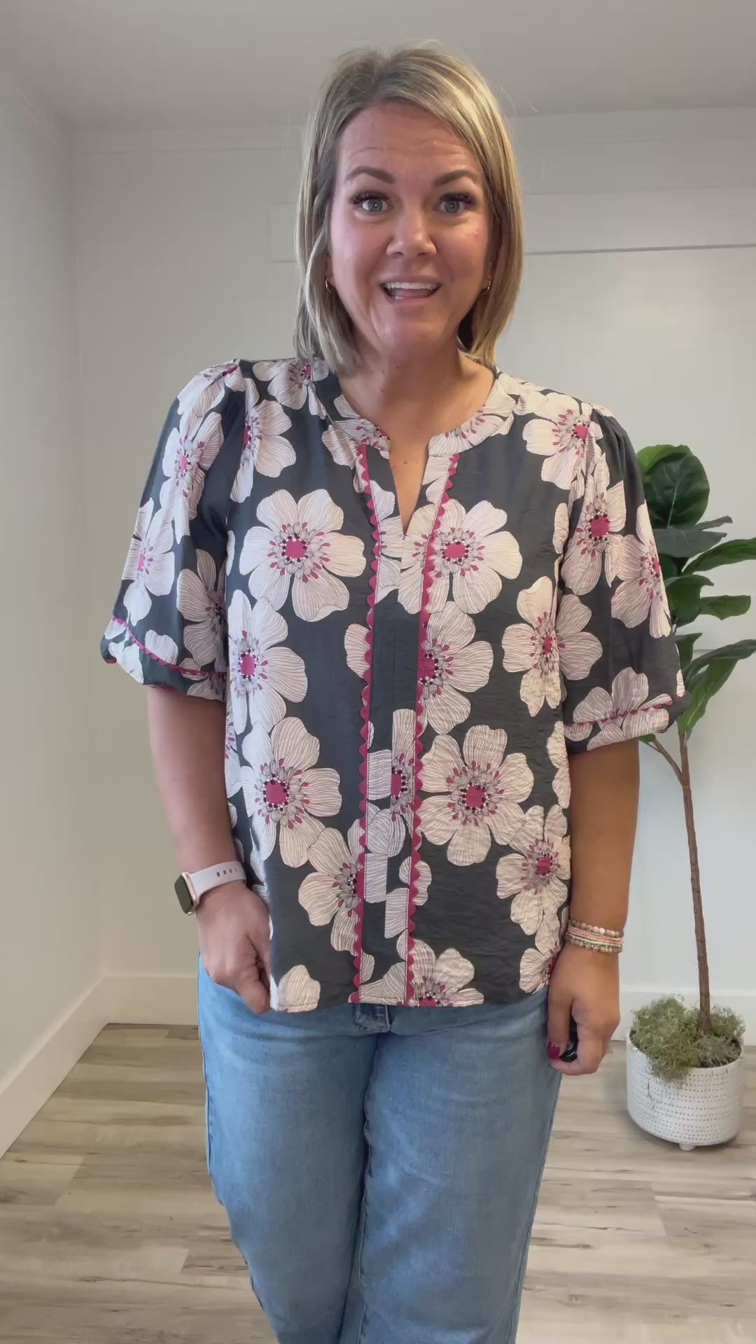 The Danielle Top brightens your day with its charming oversized rose pink floral print on a smoky charcoal background. Featuring 3/4 sleeves with elastic cuffs and playful rose rickrack accents, this relaxed-fit blouse adds a sweet touch to casual looks. The split neck gives a hint of playful flair, making it perfect for effortless, stylish comfort.