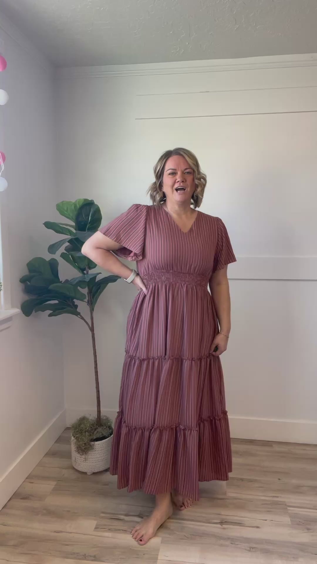 The Emsley Maxi combines effortless elegance with thoughtful design details. Flutter sleeves add a graceful touch while the fully lined construction ensures comfort and coverage. A smocked waist creates a flattering silhouette, while tiered layers provide beautiful movement and dimension. Rendered in a warm rust tone with charming gray and white stripes, this maxi dress transitions seamlessly from casual outings to special occasions. Perfect for those seeking modest style without compromising on contemporary appeal.