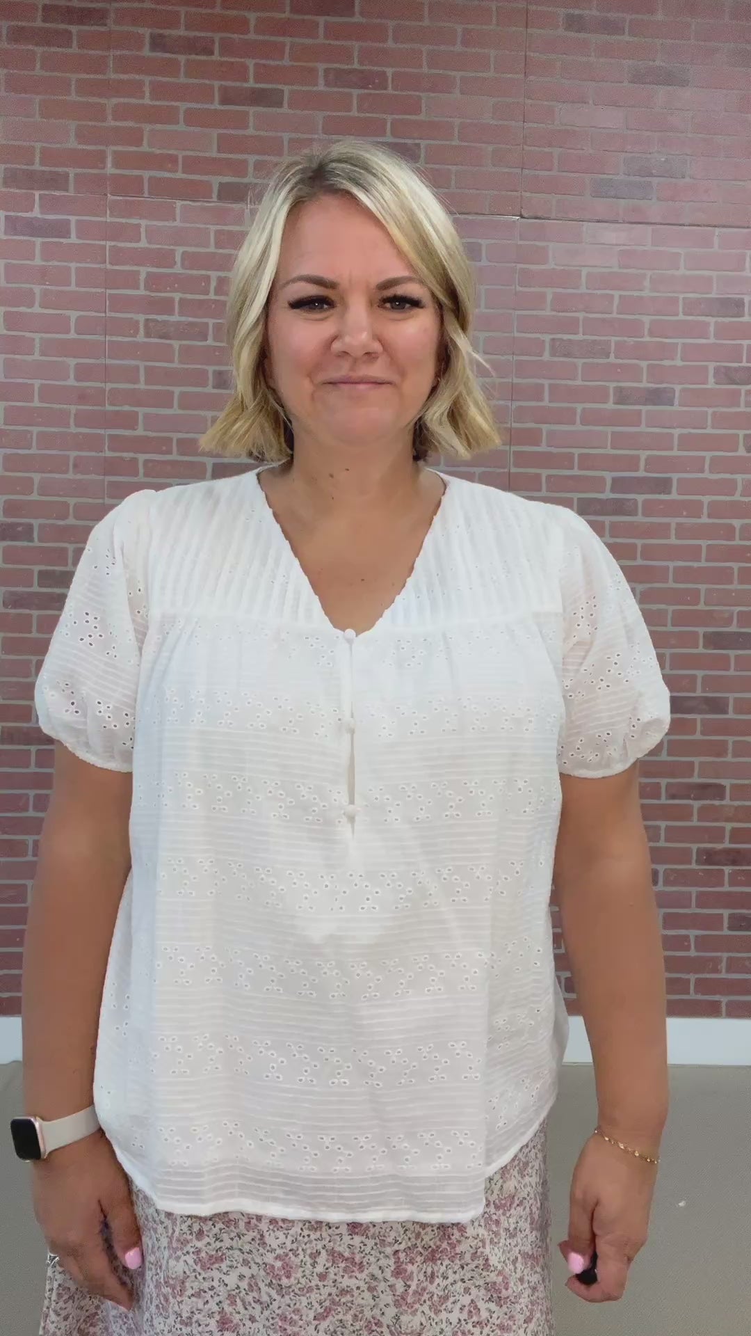 The Evelyn Top in off-white eyelet features pintuck details and playful puff sleeves that add a charming touch. Its babydoll silhouette with fabric covered buttons halfway down the front creates a breezy, loose fit perfect for warm days. The flattering V-neck and straight hem complete this effortlessly cute look.