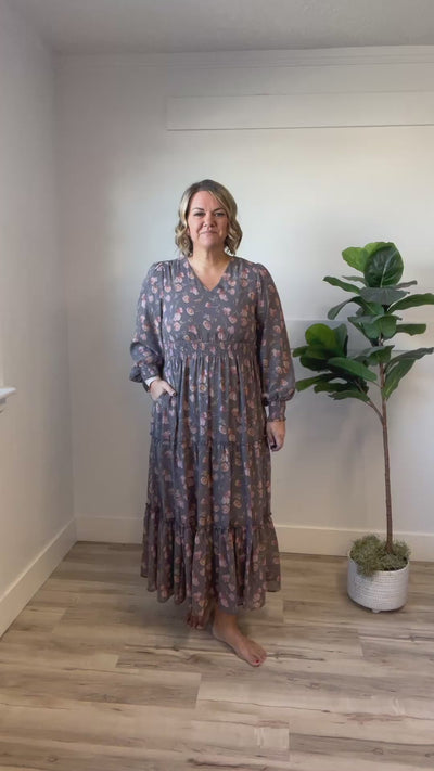The Jacey Maxi combines elegance and comfort with long puff sleeves featuring smocked cuffs and a flattering V-neck. Its gray fabric is beautifully adorned with rose pink florals, complemented by a smocked waist and delicate ruffles at the skirt tiers. Fully lined for added comfort and equipped with convenient seam pockets, this easy-to-wear maxi dress offers both style and practicality for any occasion.