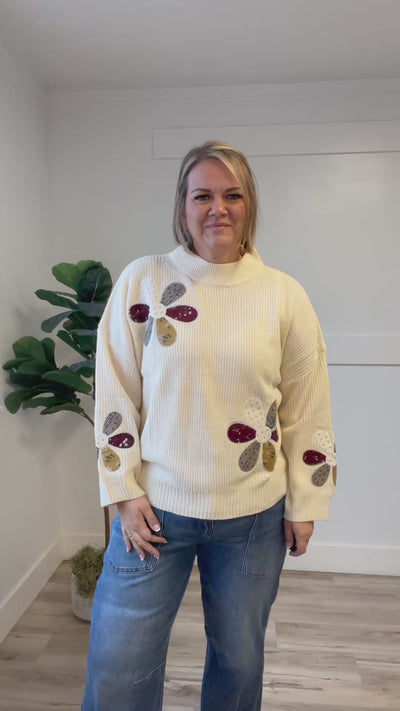 The Kendra Sweater brings whimsy to your everyday wardrobe with its charming patchwork flower appliqués scattered across a cozy long-sleeve silhouette. Crafted in a creamy natural color, this piece perfectly balances comfort with personality. Whether you're layering for cooler days or making a statement on its own, the Kendra adds a touch of joy and creative flair to any outfit. A delightful choice for anyone who loves to express their playful side through fashion.