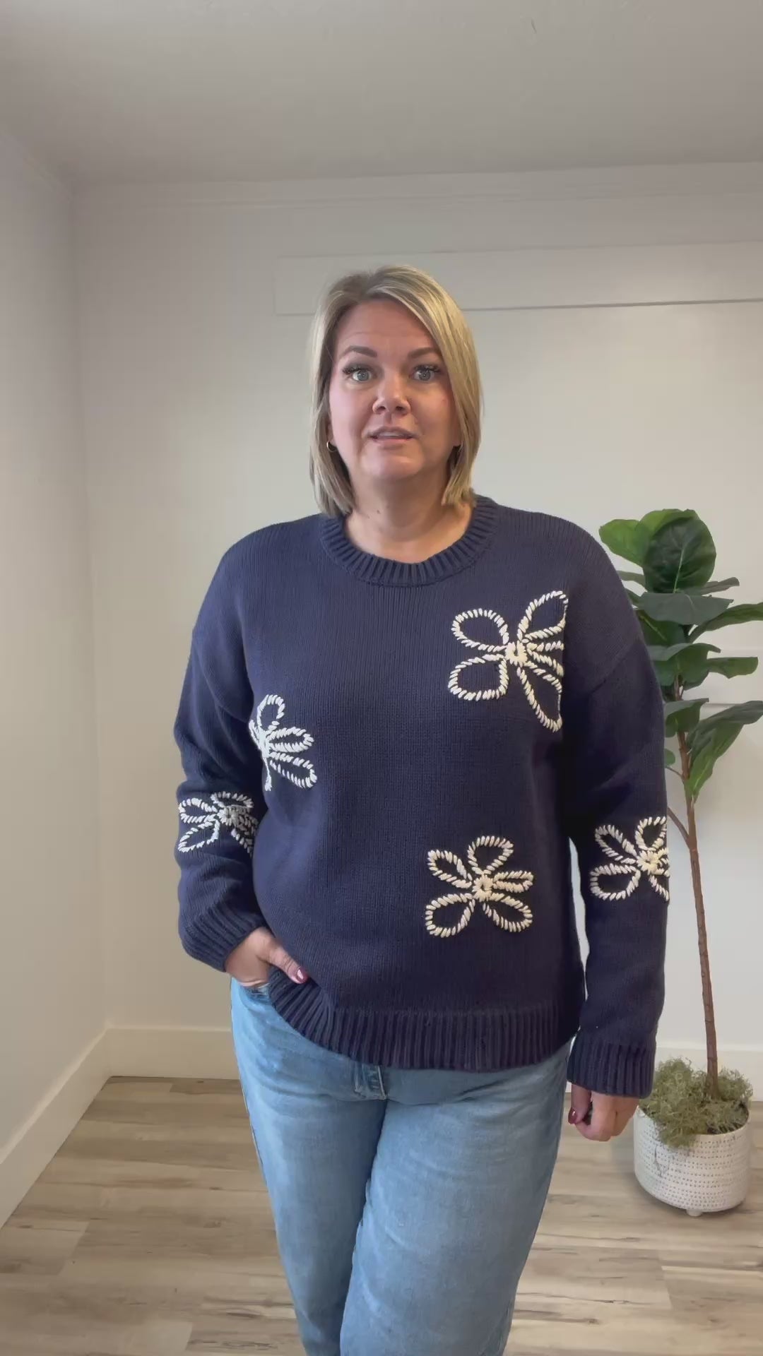 Stay cozy and stylish in the Kitty Embroidered Sweater, crafted in a thick, soft knit that keeps you warm on chilly days. Its rich navy blue backdrop makes the creamy embroidered flowers pop, adding a charming touch to your outfit. With attention to quality and comfort, this playful sweater lets you stand out while feeling great all day long. Perfect for those who love a blend of snug and sweet!