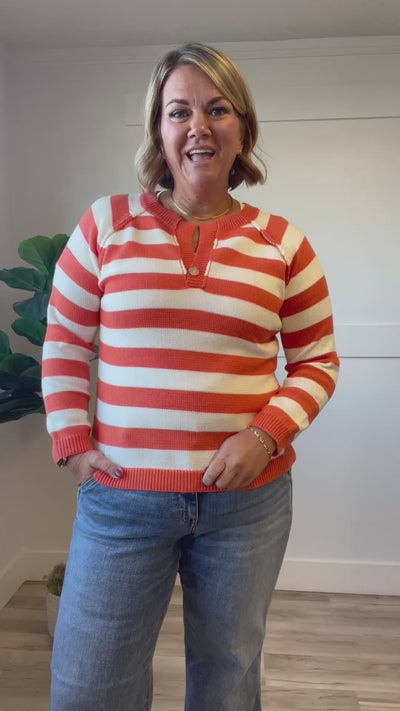 The Mariah Sweater brings a playful twist to your wardrobe with its vibrant orange and white stripes. Featuring a chic deep notch neck and a single button for a fun, flirty touch, this long-sleeve piece is detailed with stylish seam accents at the shoulders, and side vents that add subtle character and movement. Perfect for layering, it’s a lively staple that adds warmth and a burst of color to any outfit.