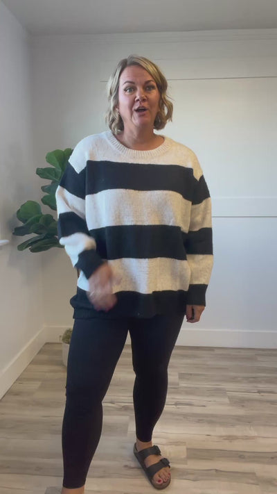 Wrap yourself in cozy charm with the Marjorie Sweater. This oversized, long-sleeve knit features wide oatmeal and black stripes that give it a bold, playful look. Crafted from super soft fabric, it promises comfort all day long. With its relaxed fit, it’s perfect for layering or lounging in style.