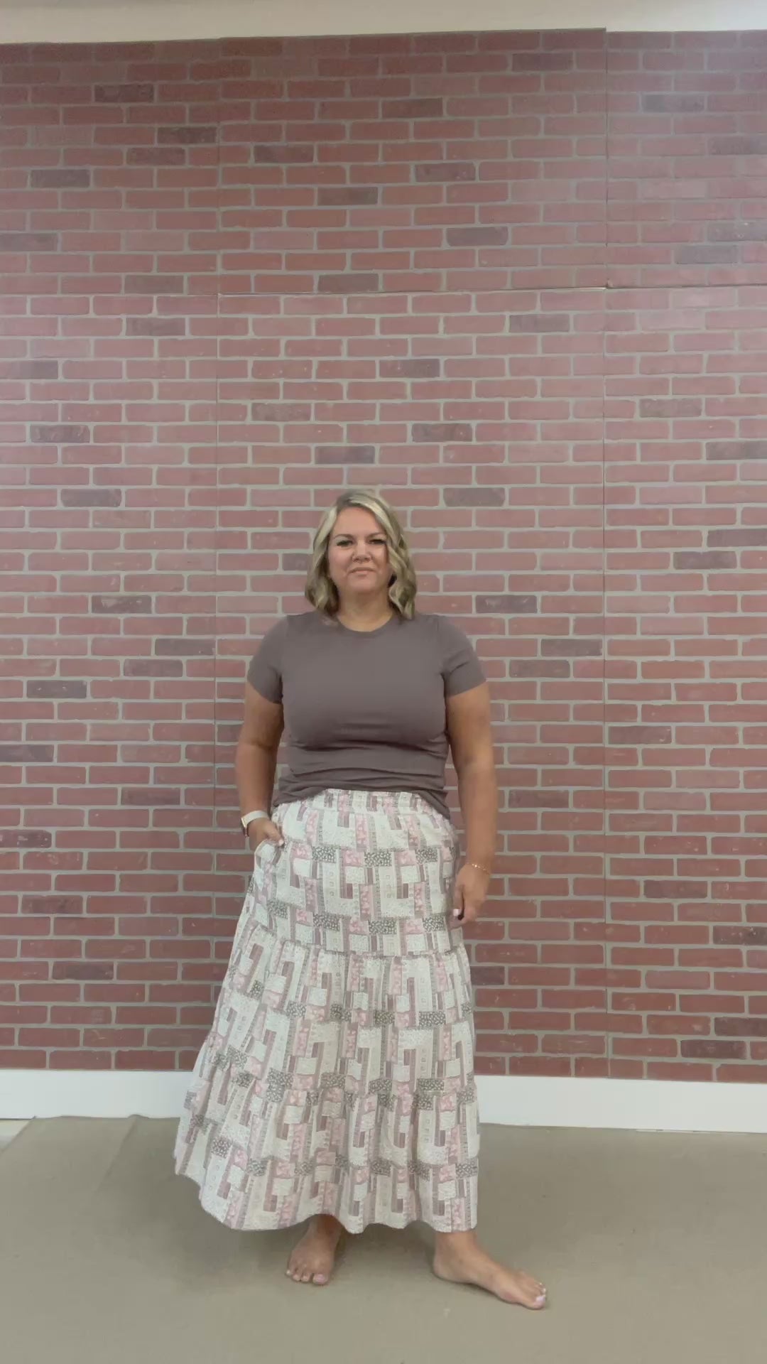 Add some color and whimsy to your wardrobe with the Myla Maxi Skirt! Featuring a playful patchwork print in shades of pink, cream, and brown, this skirt is lined and has tiered layers for a flowy silhouette. Plus, it has pockets for added convenience. With delicate florals this skirt is perfect for a day out with friends or a casual date night.