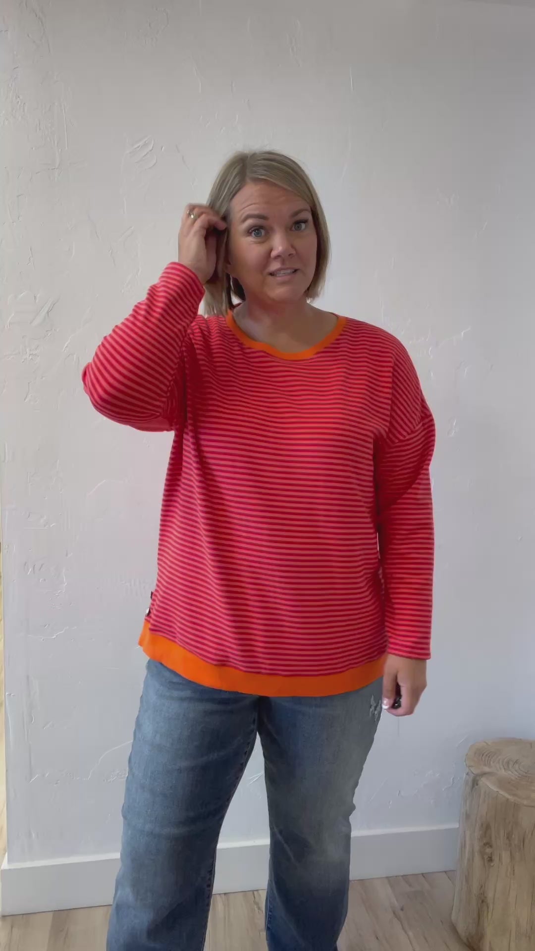 The Noa Top brings a playful pop of color with its vibrant orange and red stripes. Cozy and fuzzy, it features a relaxed drop shoulder design for easy movement. Bright orange ribbing at the neck and hem adds a fun contrast, while buttons on the side slits give it a quirky twist. Perfect for adding warmth and cheer to any outfit!