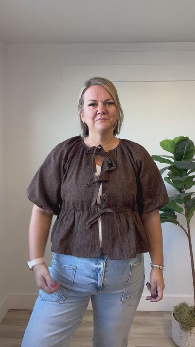 Add a wild touch to your wardrobe with the Petunia Top, featuring playful black leopard spots on a rich brown base. The tie front adds a flirty twist, while short puff sleeves bring a fun, feminine vibe. Crafted from thick denim fabric, this top combines bold style with comfortable durability. Perfect for making a statement wherever you go!