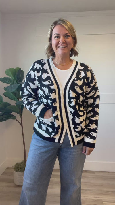 This playful Spooky Cardigan features a charming black base decorated with white ghost patterns and striped trim for a fun, stylish touch. Designed with comfort in mind, it’s soft to the touch and includes convenient pockets. The open front makes it easy to wear and layer, perfect for adding a spooky vibe to your everyday look.