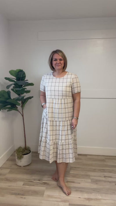 Meet your new wardrobe essential! The Tiana Midi combines timeless style with everyday comfort. This playful short-sleeve dress showcases a crisp ivory and gray plaid pattern that works with virtually any accessory. The relaxed, tiered cut flatters your figure while letting you move freely, and those hidden pockets are a total game-changer. Whether you're running errands or heading out for brunch, this versatile midi keeps you looking effortlessly polished.