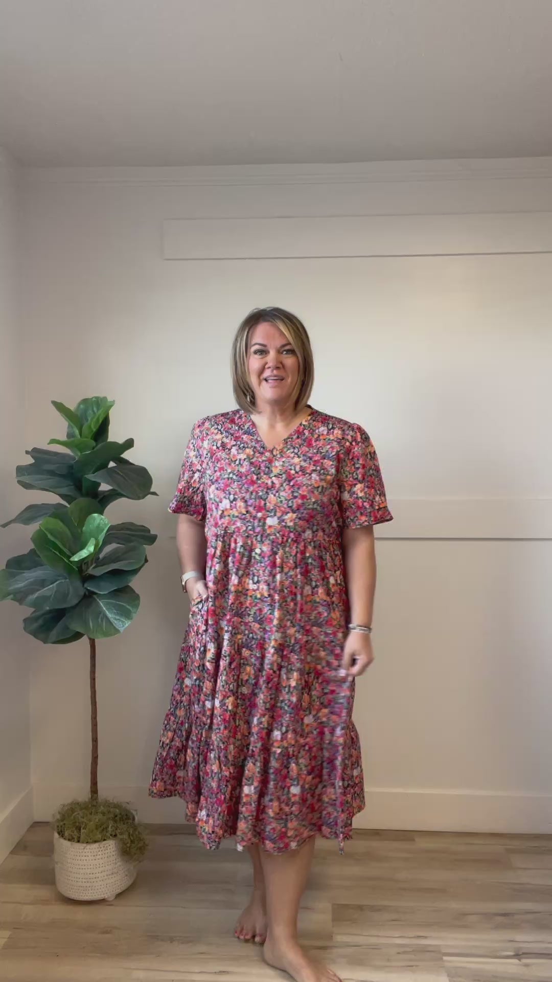 Elevate your everyday style with the Angela Midi, a charming dress that combines comfort with effortless elegance. Featuring delicate flutter sleeves and a flattering V-neckline, this stunning beauty showcases vibrant multicolored florals that bring life to any occasion. The lined construction ensures a smooth silhouette, while hidden pockets add practical functionality you'll love. Perfect for transitional seasons and versatile enough to dress up or down.