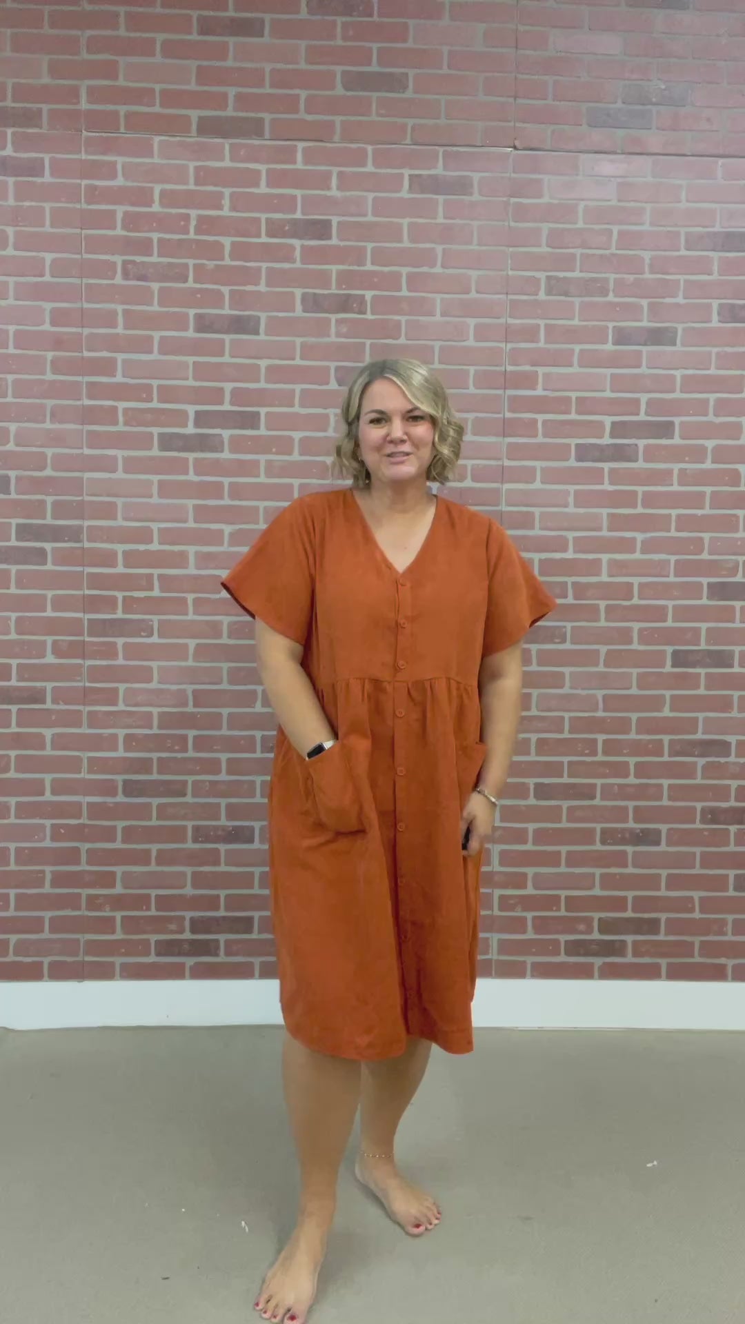 Get playful with the Camille Midi in vibrant burnt orange corduroy. This charming dress features a comfy V-neck, short sleeves, and an empire waist that flatters every silhouette. Button up the front for easy style, and enjoy the practical touch of patch pockets perfect for little essentials. A fun and cozy choice for any casual occasion!