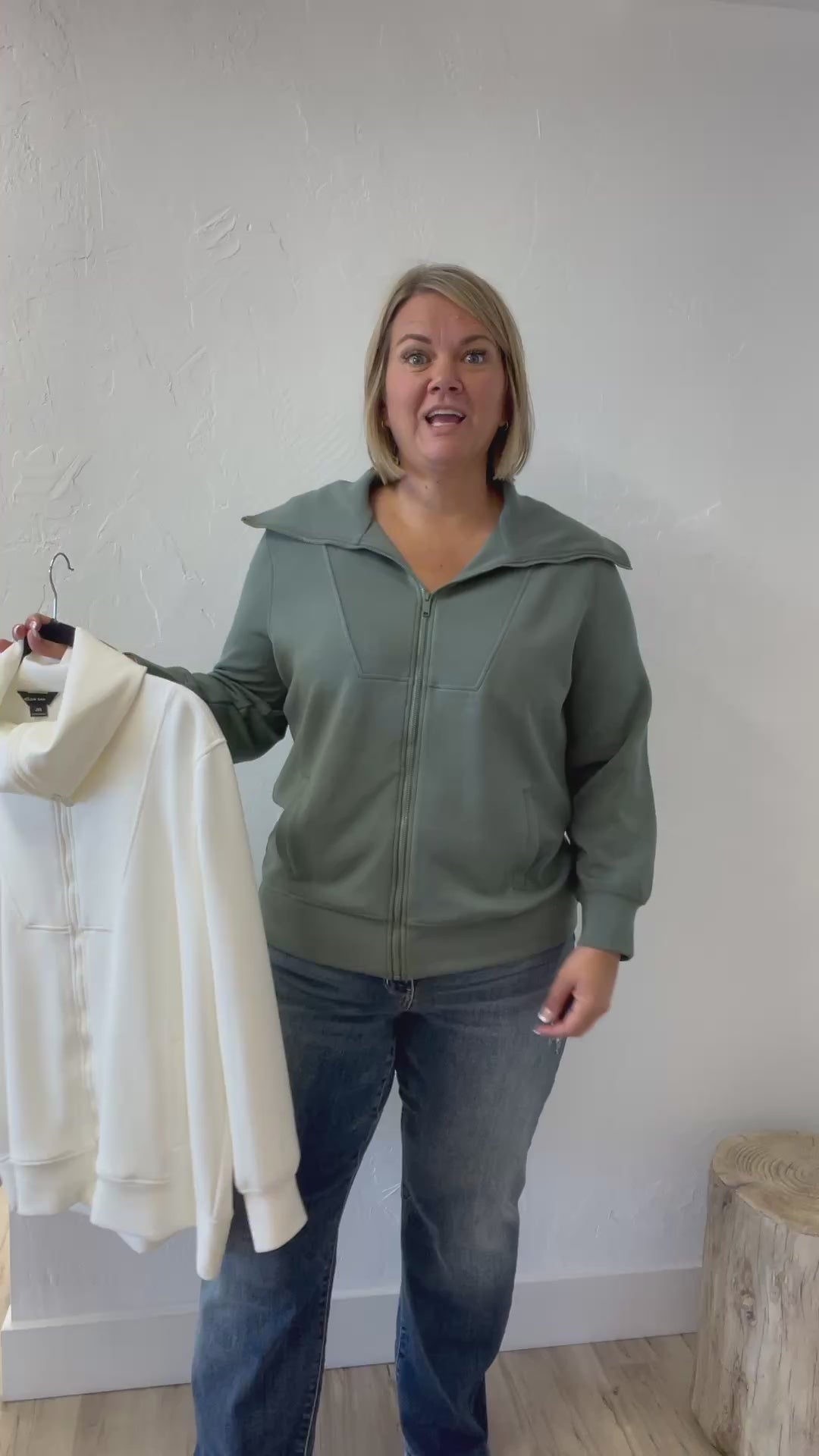 Stay cozy and stylish with the Cassidy Zip Up. Made with soft modal fabric, this full zip jacket features a high neck and long sleeves for added warmth. The front pockets are perfect for keeping your hands warm or storing small items. Perfect for those chilly days! Comes in cream or fern green.