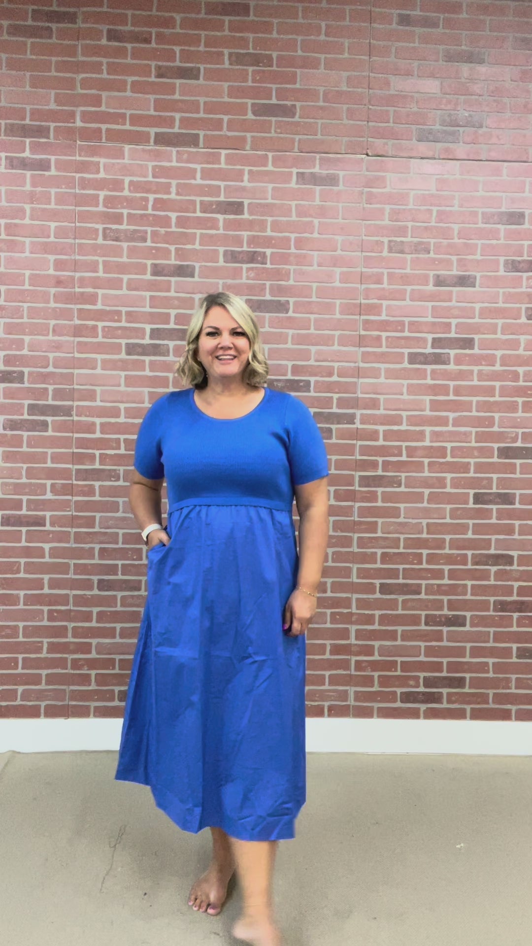 The Emersyn Midi combines a playful vibe with practical style, featuring a royal blue ribbed top with short sleeves and a round neck. Its smooth skirt flows effortlessly, while handy pockets keep your essentials close, making this dress as fun as it is functional.