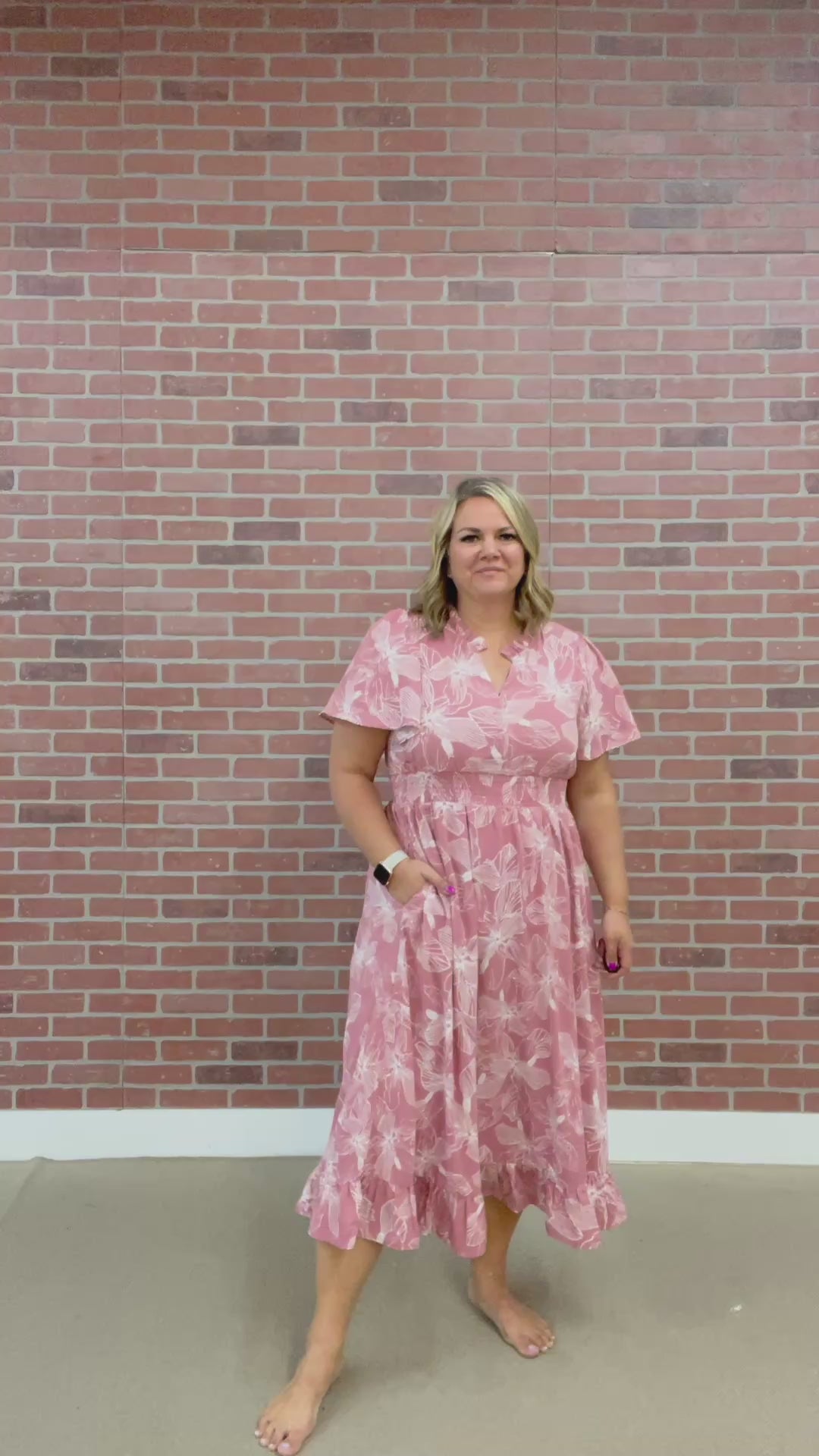 The Fern Maxi captivates with its romantic dusty pink fabric adorned with delicate white florals. Featuring charming short flutter sleeves, a ruffle collar and a flattering smocked waist that accentuates your silhouette, this dress offers both comfort and elegance. The feminine ruffle hem adds movement to your step, making this short-sleeved beauty perfect for any occasion where you want to feel effortlessly stylish and confidently feminine. Fully lined for your comfort and with pockets for convenience, the Fern Midi is sure to be a favorite.
