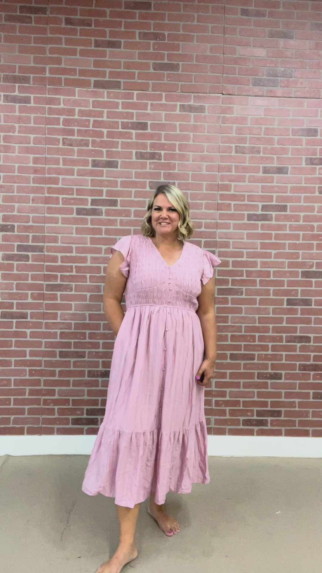 The Giselle Maxi in dusty pink features playful short flutter sleeves and a flattering V-neck. Its smocked bodice and Basque waistline create a charming silhouette, while the subtle crinkle texture and tone-on-tone stripes add delicate detail. Fabric-covered buttons run down the front, complemented by a large ruffle hem and handy pockets for a fun, feminine look.