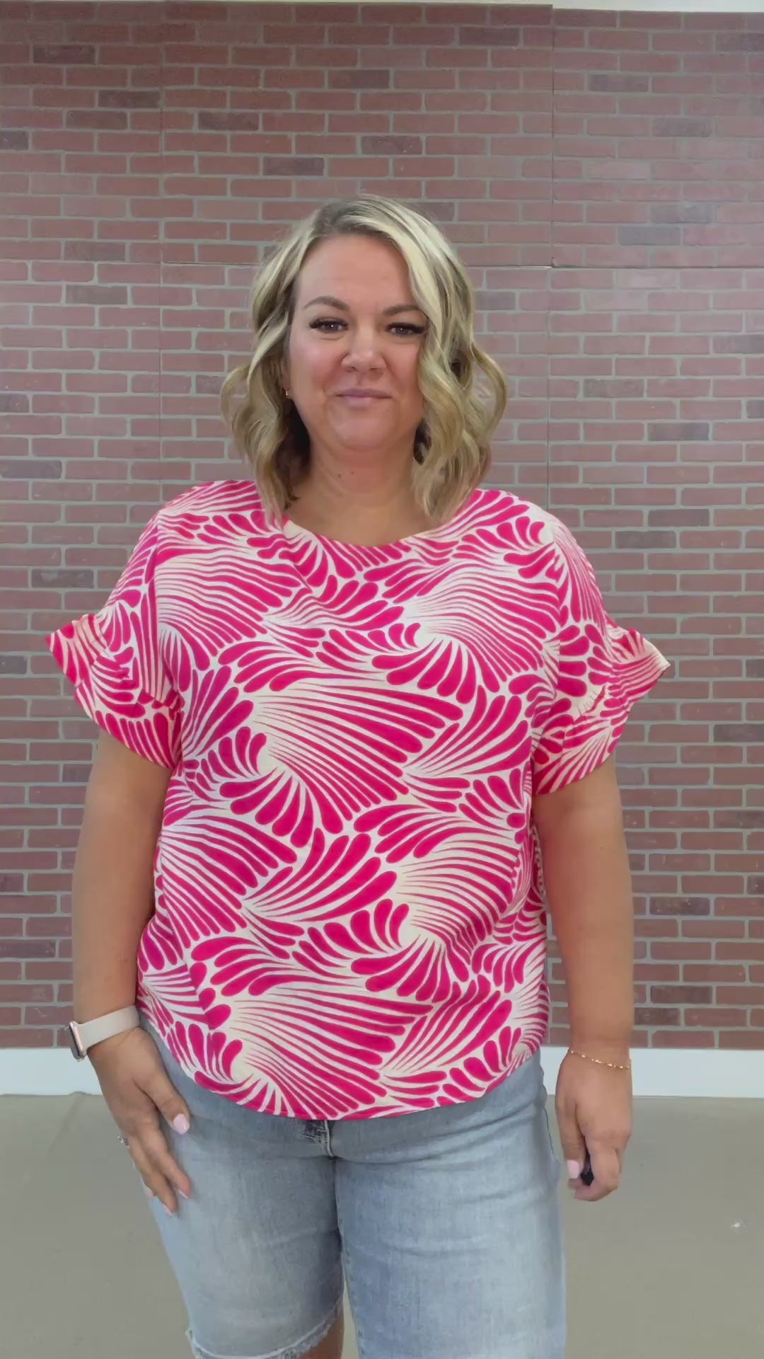 Experience effortless style and feminine charm in our Heather Top. The white and hot pink geometric pattern adds a playful touch to this flowy, dolman sleeve top with a delicate ruffle. Perfect for a day out with friends or a date night, this top will elevate any outfit with its flirty and chic design.
