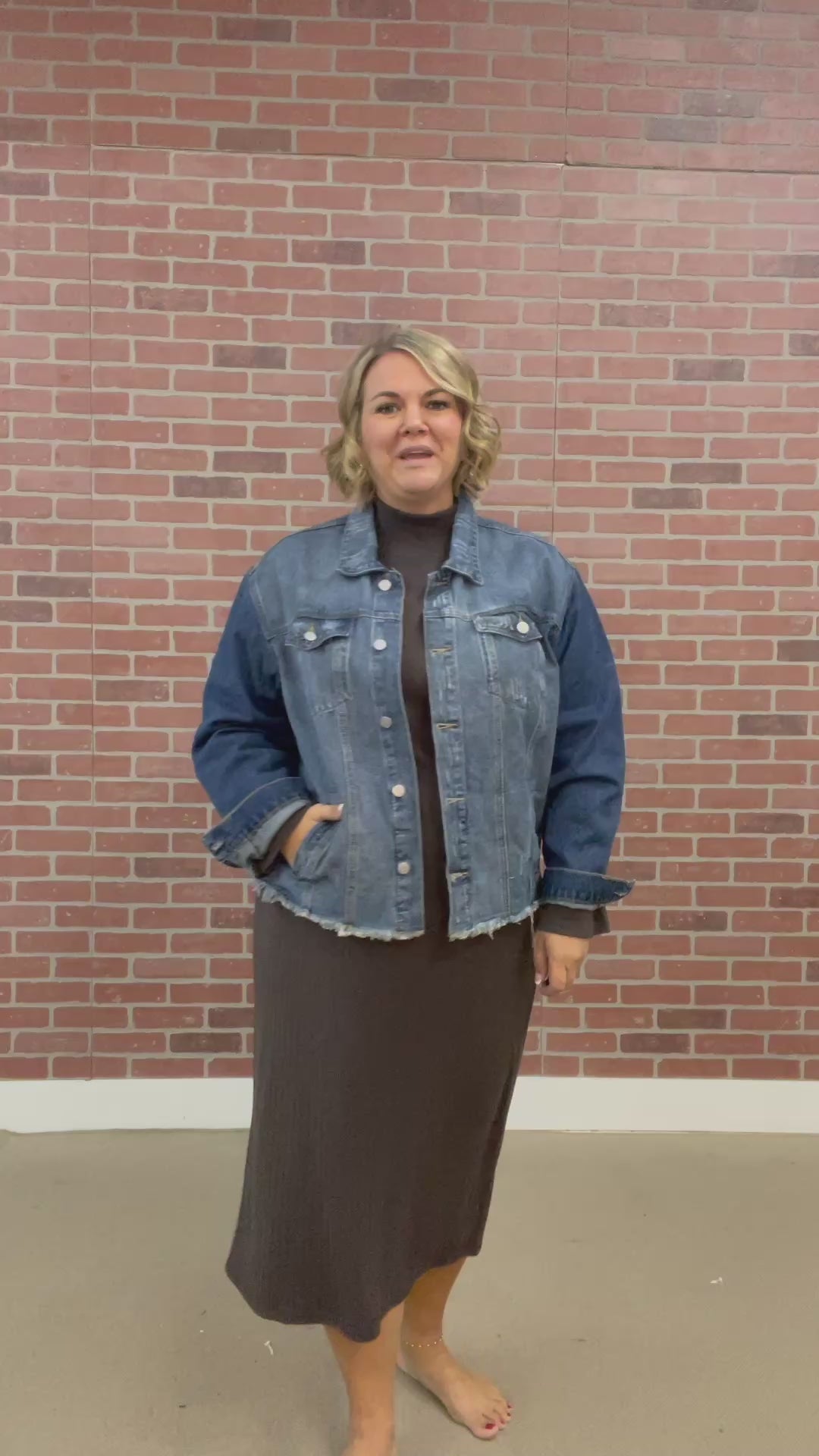 The Janice Denim Jacket combines all the essentials you want in a stylish outer layer. Featuring a dark wash with a distressed finish it brings effortless edge to any outfit. There are no holes on this distressed jacket, just some grinding marks and a raw hem. Its long sleeves and button-up front offer versatile coverage, while practical pockets add functionality. The sleeves and lower back have a darker wash than the front. This jacket is designed to be your go-to piece for layering with comfort and cool, making it a must-have in your wardrobe.