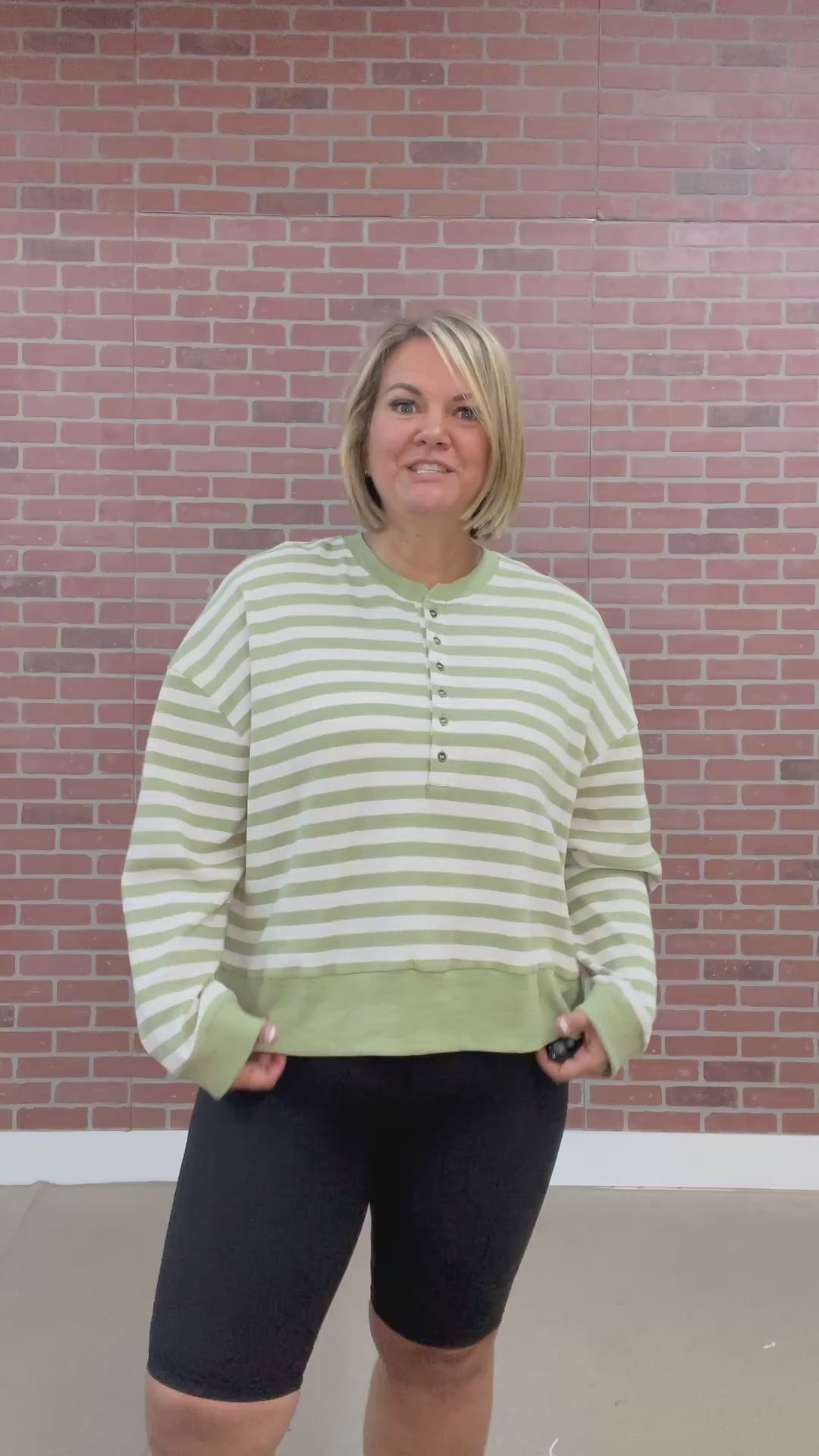 Cozy up in the Joey Striped Top, featuring playful sage and white stripes that brighten your day. This long-sleeve button-up combines a thermal textured fabric with banded cuffs, hem, and neck for a snug, stylish fit. Side slits add a fun twist, making it perfect for layering or wearing solo on cooler days.
