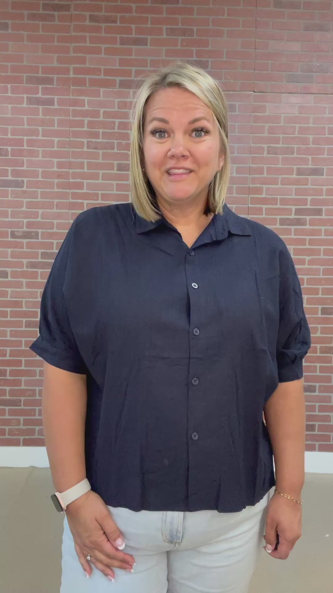 The Katie Top in midnight navy blue features a breathable linen-look fabric that keeps you cool and comfortable. Its oversized fit, short sleeves with banded cuffs, and classic collar create a relaxed yet refined style. The button-up front and yoke detail add subtle sophistication, while the hi-lo hem offers a modern silhouette. Perfect for effortless elegance, this versatile top elevates any outfit with ease.