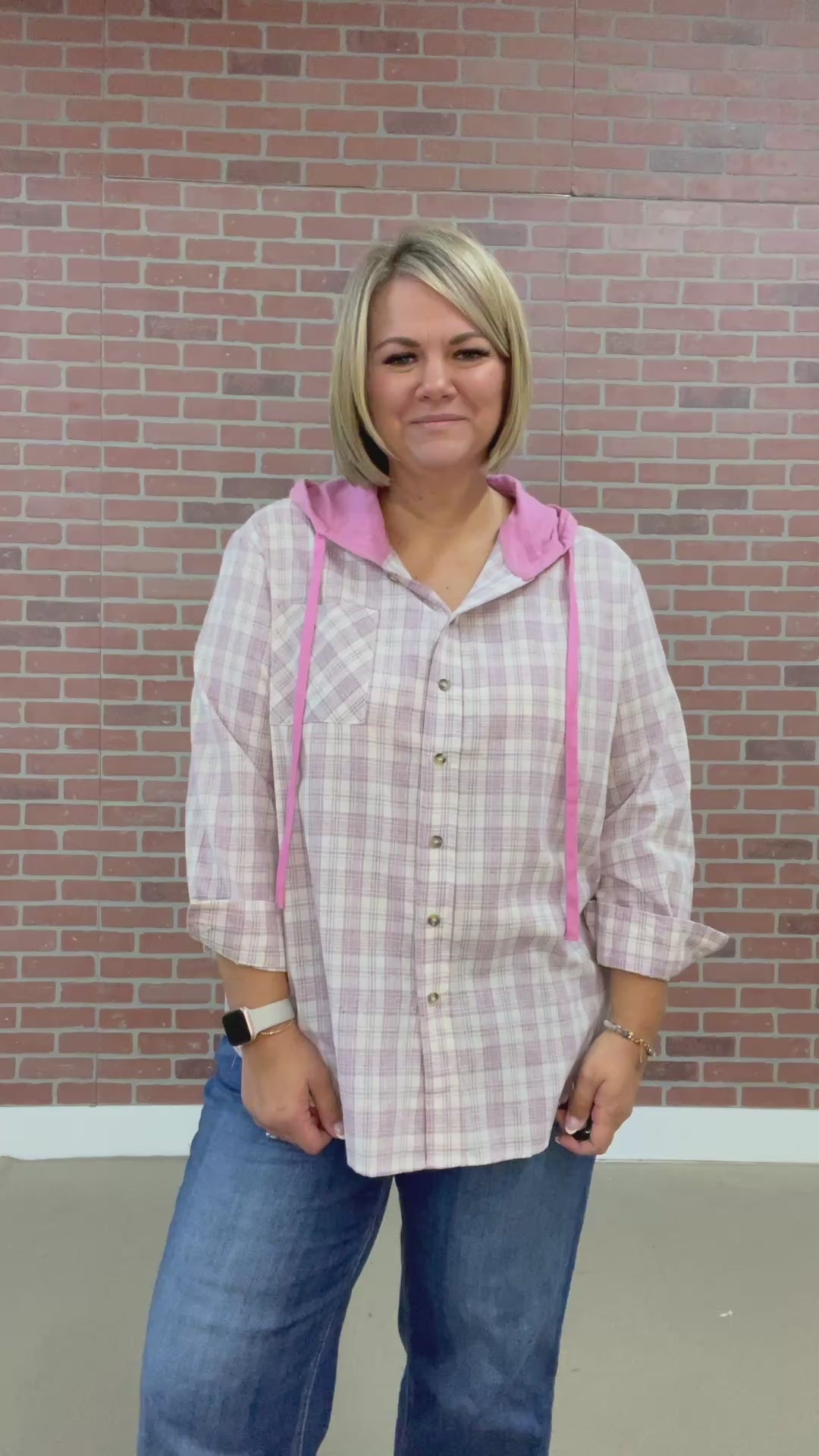 Stay cozy and stylish with the Linda Top, a playful lightweight shacket featuring a charming light purple and cream plaid pattern. This button-up design is perfect for layering, while the bright pink hood adds a fun pop of color and extra warmth. Ideal for breezy days, it combines comfort and flair effortlessly.