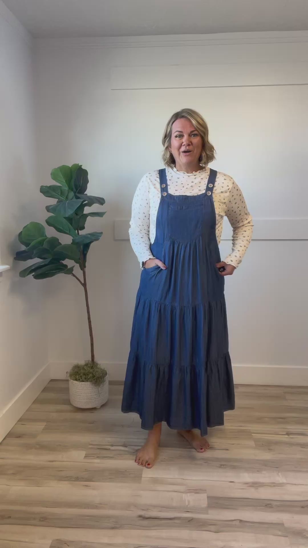 The Linnea Maxi Jumper is your new go-to for effortless style and comfort. Made from lightweight washed chambray, it features playful tiered layers and handy slant pockets for all your essentials. Adjustable button straps and a cute pocket on the bib add charm and a perfect fit. Whether you're out and about or relaxing, this jumper keeps things breezy and fun!
