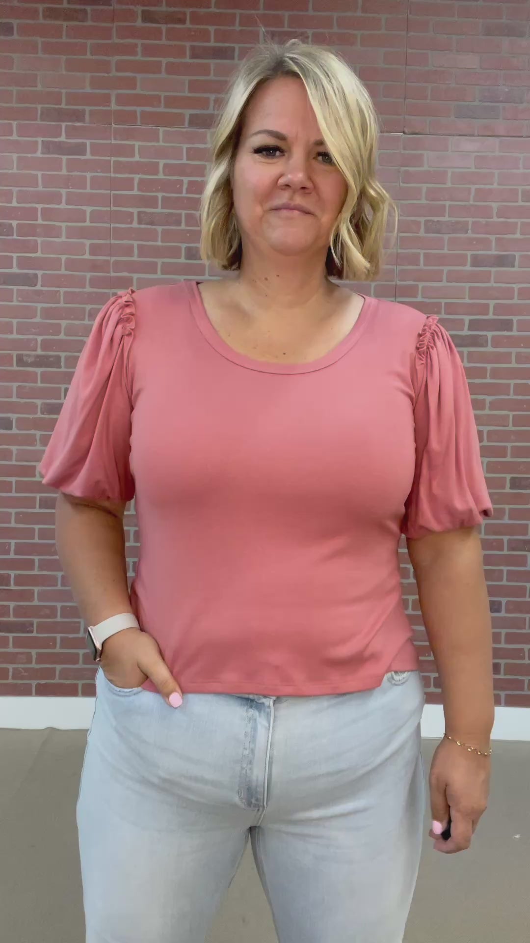 The Maya Top in a charming mauve shade features playful short balloon sleeves and delicate ruffle shoulders that add a flirty touch. Its small scoop neckline keeps things sweet and simple, while the soft fabric ensures all-day comfort. Perfect for mixing and matching, this versatile top brings a fun, feminine vibe to any outfit.