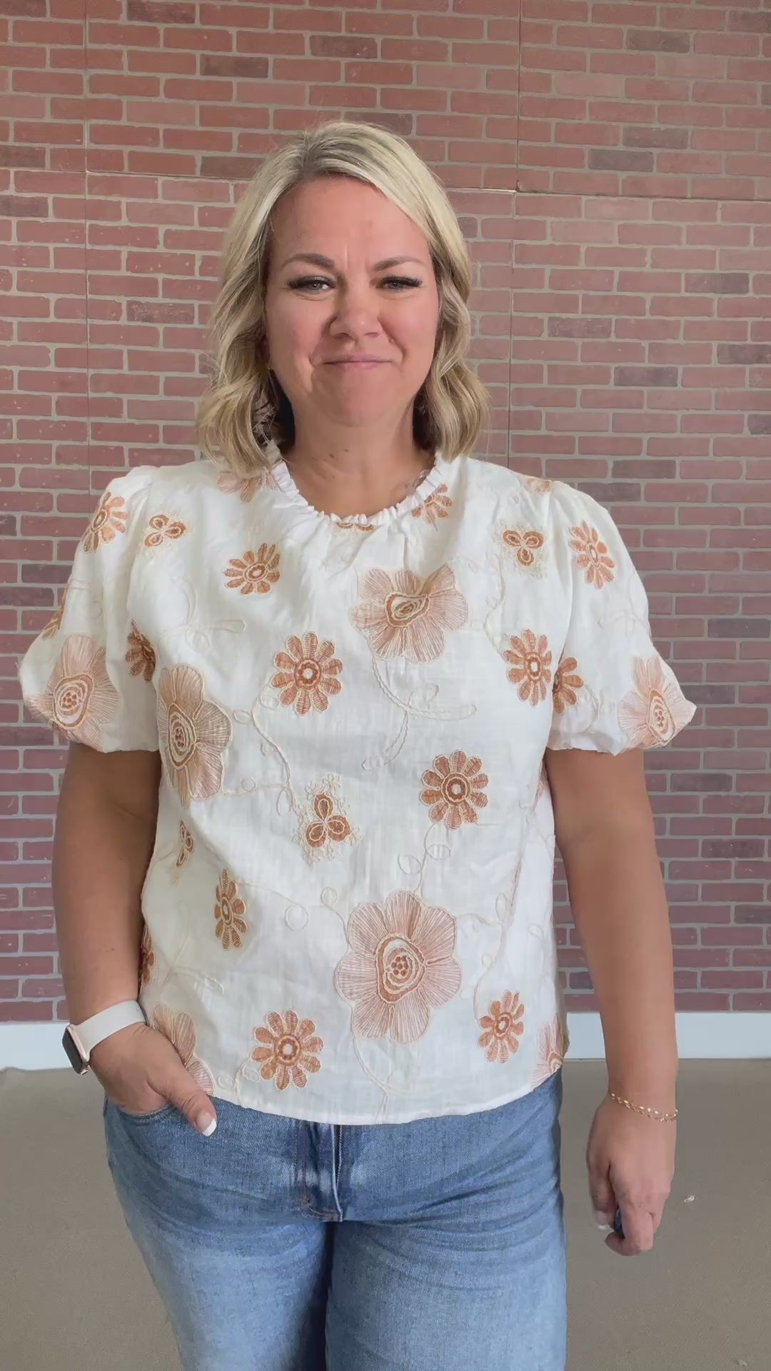 The Nancy Embroidered Top brings a playful touch to your wardrobe with its ivory linen-look fabric and charming cream and terracotta oversized floral embroidery. Featuring whimsical balloon sleeves, a ruffle neck, and a keyhole close, this lined top offers both comfort and style. Its straight hem adds a relaxed finish, perfect for effortless, breezy days.