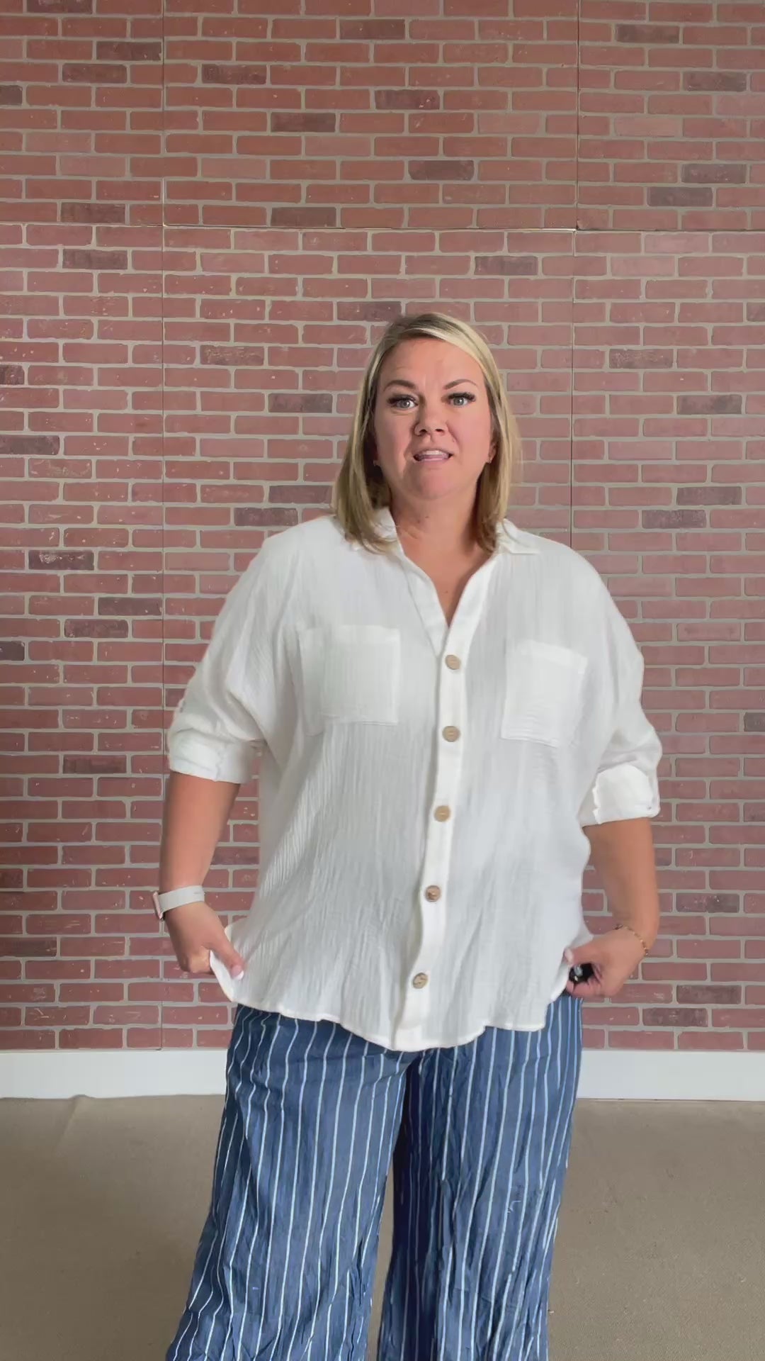 Slip into the breezy Natalia Top for instant summer vibes! This white gauze button-up features a flattering collar and handy breast pockets for a touch of functionality. Roll up the sleeves and secure with the adjustable tabs when the fun heats up, or keep them down for a more polished look. Your new favorite go-with-everything piece awaits!