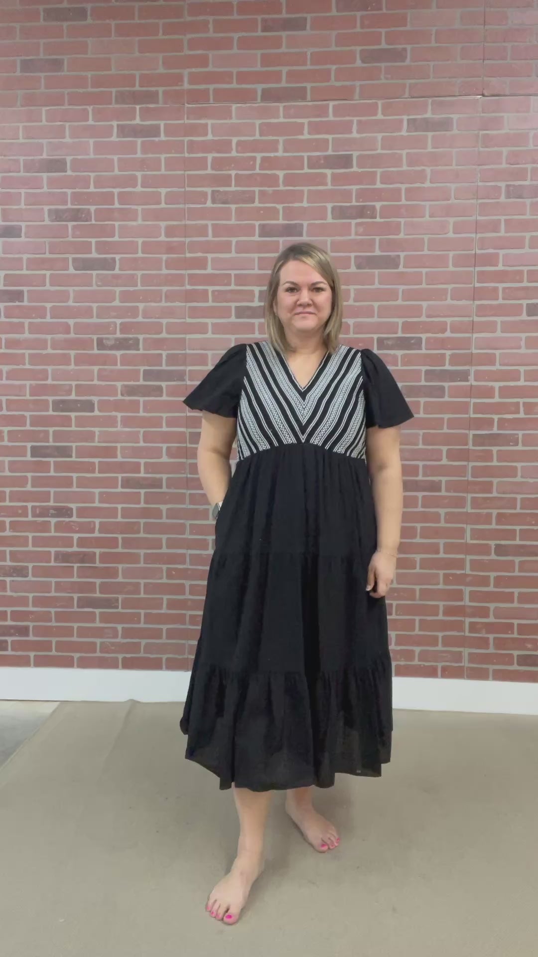 Get your groove on in the Paisley Maxi! This playful black dress features a smocked bodice with white stripes and zig zags. The rick-rack trimmed v-neck adds a unique touch. With short flutter sleeves, a lined skirt, and seam pockets for convenience, you'll be the coolest cat on the block!
