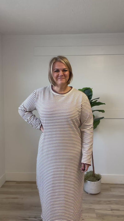 The Paxton Maxi is your new layering essential! This cozy knit dress features a charming cream base with rich brown stripes and accents that pair beautifully with everything in your closet. The straight silhouette skims your frame for effortless comfort, while adorable blanket-stitched sleeve cuffs add a playful finishing touch. Perfect for throwing over your favorite pieces or wearing solo, this versatile maxi keeps you feeling comfy and looking put-together all day long.