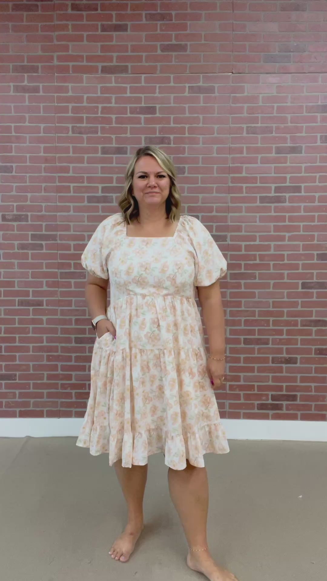 Get ready to turn heads in the Poppy Midi! Featuring short puff sleeves, a smocked back, and a square neckline, this flowy white dress is delicately adorned with peach florals, adding a touch of whimsy. The tiered design and ruffled hem complete the playful look. Perfect for any sunny day, this dress is sure to be your new go-to. (Flower power not included!)