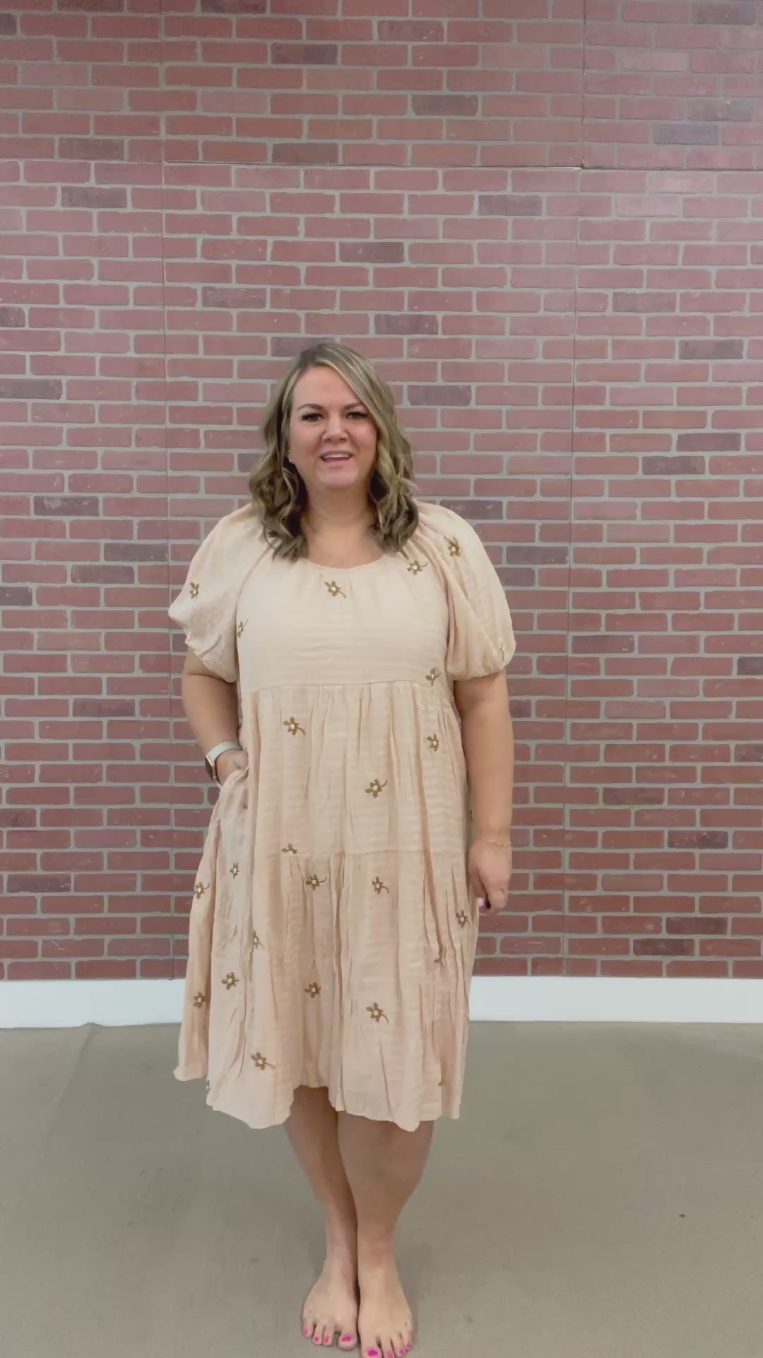 Indulge in the luxurious sophistication of the Rio Midi. This stunning dress features a tan base with short raglan sleeves and an elastic cuff for a comfortable and chic fit. The round neck and tiered design add a touch of elegance, while the brown cross stitch embroidered florals and textured, lightweight fabric elevate the overall aesthetic. Complete with seam pockets and a lining for practicality, this dress is a must-have for any fashion lover.