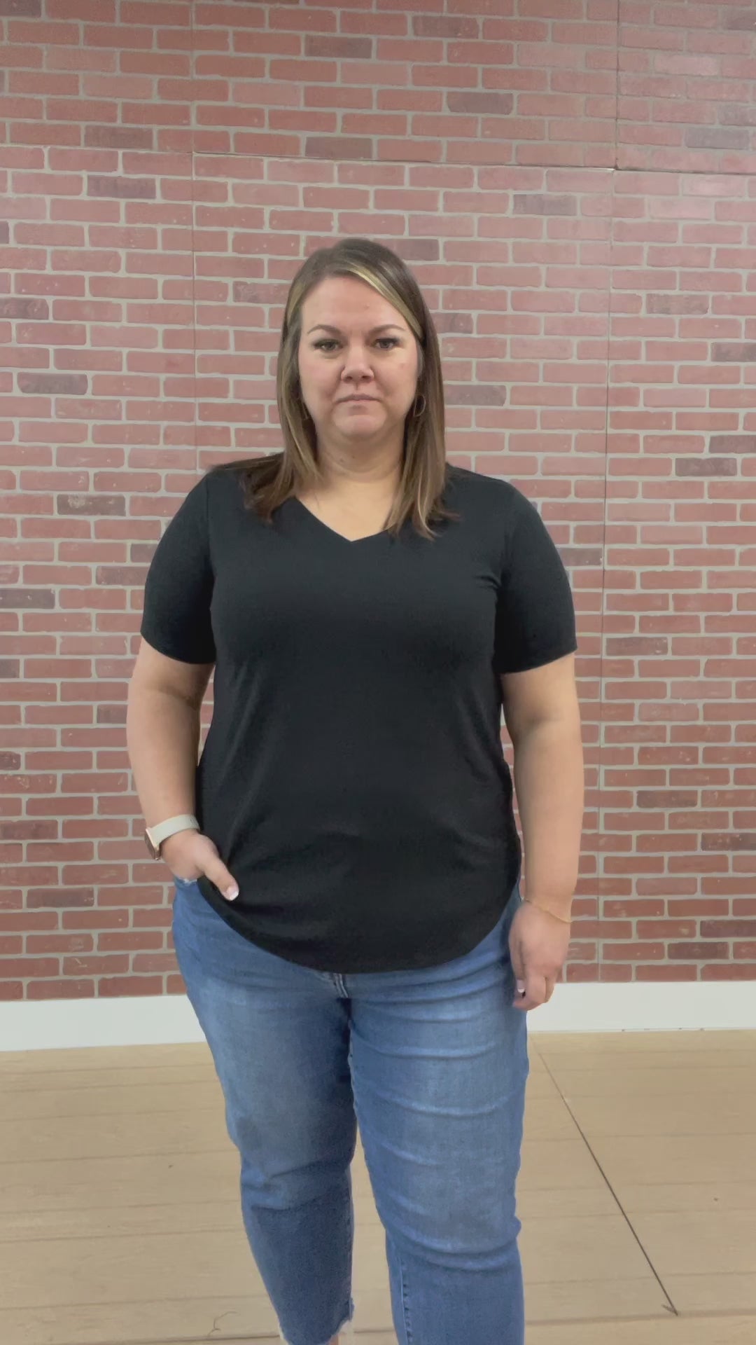 Le Dani Tee : une chemise col V douce et simple. Avec son ourlet arrondi, il offre une longueur de manches idéale pour un usage quotidien. Disponible dans une variété de couleurs, ce t-shirt basique est fabriqué avec des matériaux de qualité. (Bonus : parfait pour superposer ou jouer en solo !)