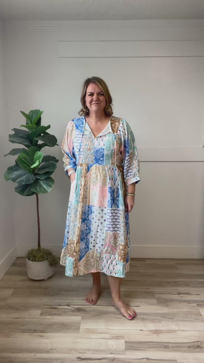Introducing the Tiffany Midi—a burst of color and charm! This playful3/4 sleeve dress features a vibrant patchwork print mixing blues, mint green, pink, and white florals that dance across the fabric. The sweet tie-neck detail adds a flirty touch perfect for spring outings, brunches, or casual adventures. Mix patterns, mix moods, mix it all up with this delightful midi that celebrates bold, joyful style.