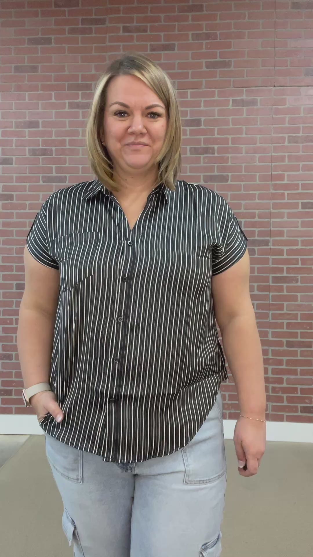 Add a touch of sophistication to your wardrobe with the Whitney Top. Featuring short cuffed dolman sleeves with a button tab, an open v neck, and a button up front, this black with white stripes top will elevate any outfit. The shirttail hem, breast pocket and back yoke add flattering and unique details.