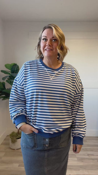 The Addie Striped Top offers a comfortable, loose fit with a casual yet stylish look. Featuring blue and white stripes complemented by solid blue ribbed bands at the hem, cuffs, and neck, it’s both visually appealing and thoughtfully designed. The stitched V detail at the neck adds subtle charm, while the drop shoulder and long sleeves enhance ease of movement. This pullover is perfect for layering or wearing on its own, providing a cozy, relaxed style you’ll reach for again and again.