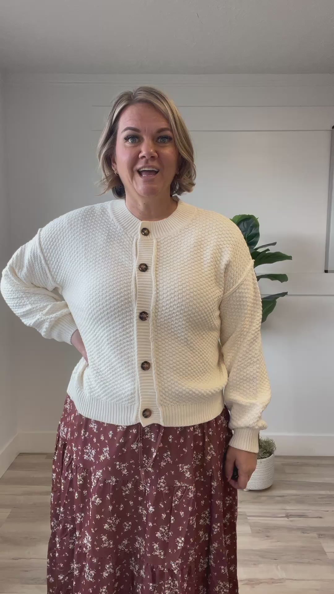 The Alexa Cardigan brings cozy charm with its textured waffle knit and effortless drop-shoulder silhouette. Slip into this cream-colored essential featuring contrasting brown buttons that add a touch of warmth and character. The generous round neckline, wide placket, seam detail and feminine puff cuffs create an inviting, relaxed vibe perfect for layering. Long sleeves keep you comfortable through any season, while the playful details make this cardigan a delightful addition to your everyday wardrobe.