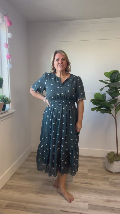 This playful, textured dark green midi dress features delicate white embroidered florals and scalloped details on the hem and sleeves. The open neck and elastic waist create a comfortable, flattering fit, while the fully lined fabric ensures coverage. Finished with a large ruffle hem, it’s perfect for adding a fun, feminine touch to any occasion.