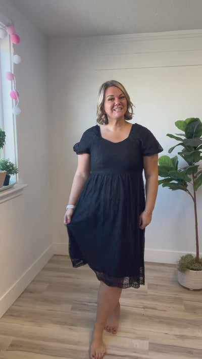 The Andie Lace Midi features a sophisticated black lace overlay with a flattering sweetheart neckline and elegant balloon sleeves. Designed with a back elastic waist for a comfortable fit, this fully lined dress combines style and ease seamlessly. Perfect for refined occasions, its delicate details offer timeless charm and effortless grace.