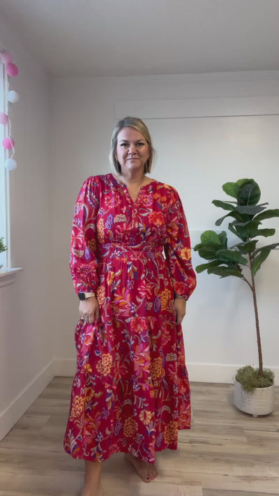 The Angelina Midi dress combines a bold, multi-colored floral pattern with a vibrant red base. Featuring long sleeves with elastic cuffs and a flattering elastic waist, it offers comfort and style. The tiered skirt with a slight crinkle texture adds movement, while seam pockets provide practicality. An open V-neck mandarin collar completes this versatile piece perfect for any occasion.