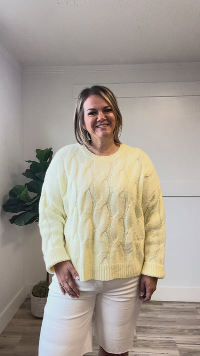 The Annette Sweater combines timeless elegance with everyday comfort. Crafted in a soft, pale yellow cable knit, this long-sleeve piece features a classic round neckline and relaxed drop shoulder silhouette for an effortlessly chic look. The intricate cable knit texture adds visual interest and depth, while the gentle hue complements a variety of skin tones. Perfect for layering or wearing solo, this versatile sweater transitions seamlessly from casual weekends to cozy evenings. A wardrobe essential that feels as good as it looks.
