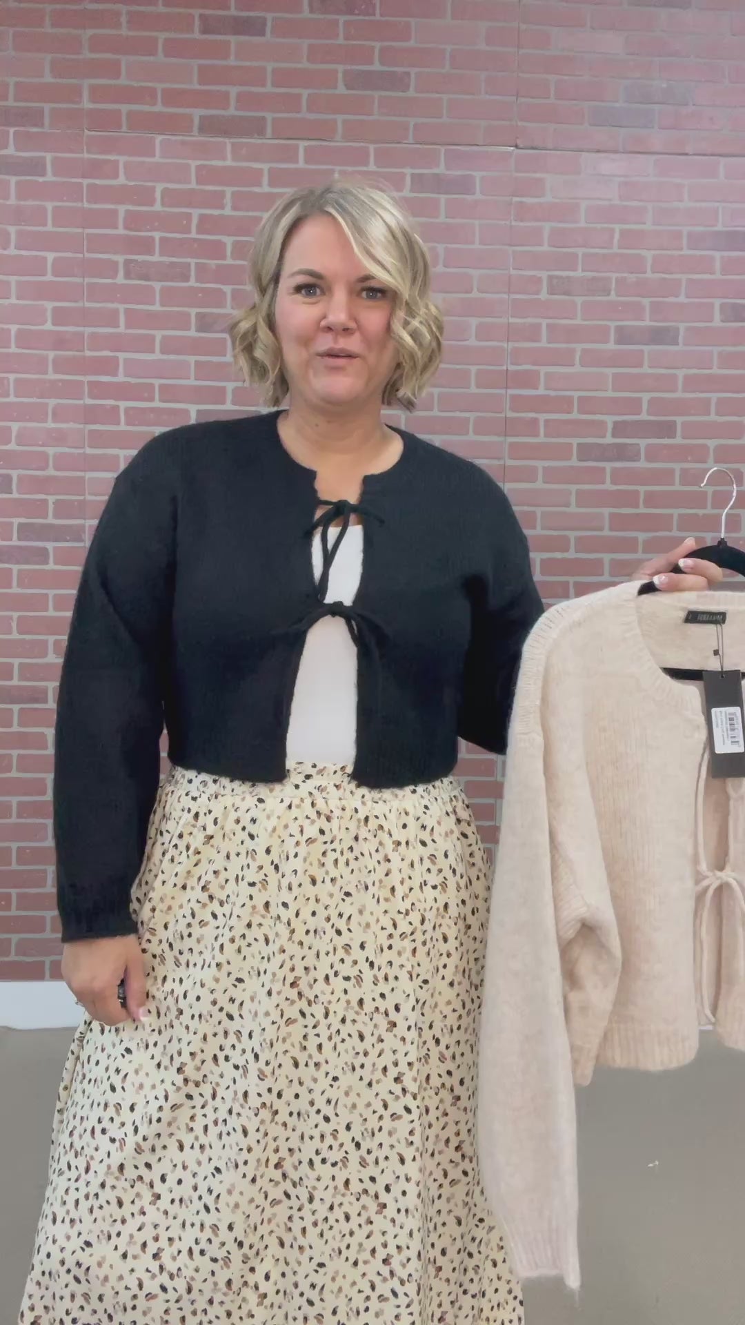 The Araceli Sweater is a cozy long-sleeve cardigan designed with a trendy cropped fit and a tie-front detail. Perfect for layering, it offers both comfort and style, making it an ideal choice for cooler days while adding a flattering touch to your outfit. This sweater supports your need for versatility and effortless fashion. Available in black or oatmeal beige.