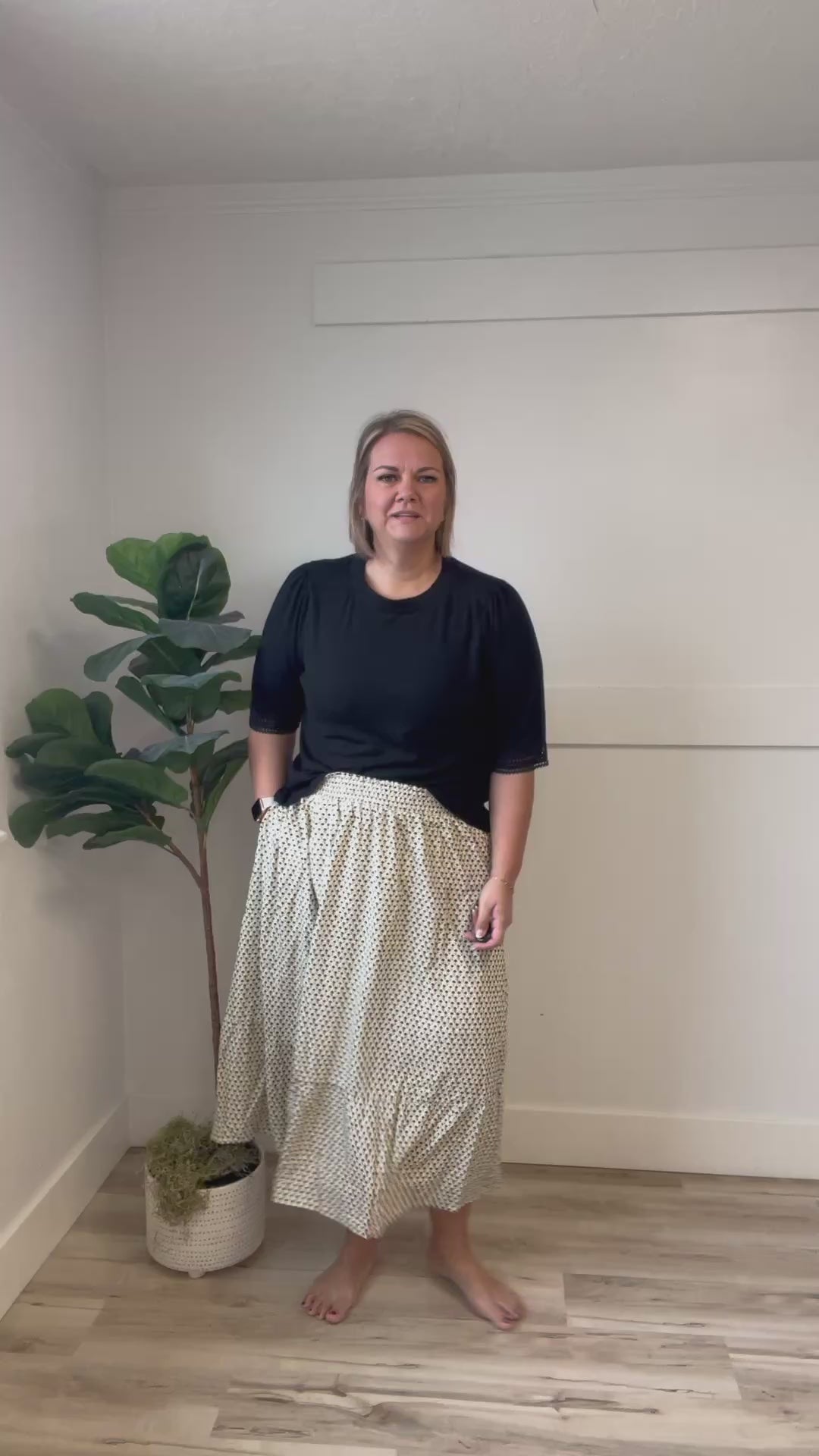 The Ashton Midi Skirt is your new go-to for effortless charm. This cream-colored beauty features tiny, soft black florals that dance across the fabric, paired with a playful large ruffle hem that adds serious twirl-worthy movement. The wide elastic waist keeps things comfy all day long, while hidden seam pockets are the cherry on top—because who doesn't love a skirt that actually holds your stuff? Perfect for anyone who loves sweet, modest style with a fun edge.