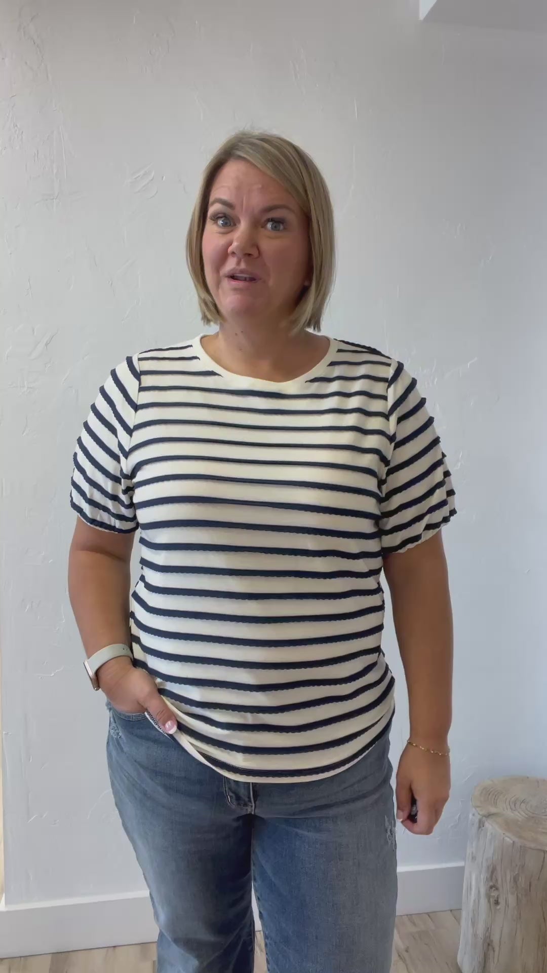 The Aurora Top brings a playful touch to your wardrobe with its soft fabric accented by charming scalloped ribbon stripes. Featuring puff sleeves and a straight hem, this short-sleeve shirt combines whimsy and comfort for a fresh, fun look.