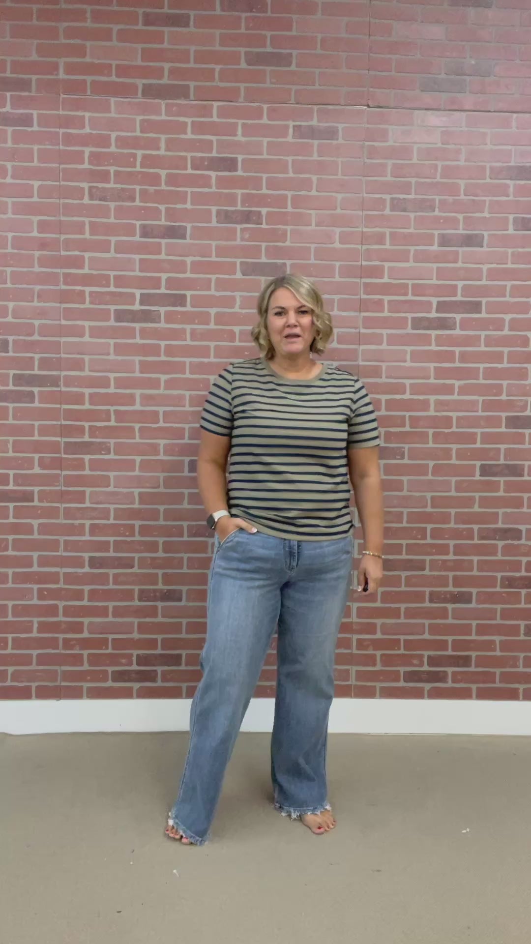 Model in striped shirt is wearing a size 7 and is 5'6". Model in cream and black floral shirt is wearing a size 11 and is 5'5". Model in green striped shirt is wearing a size 16W and is 5'11".