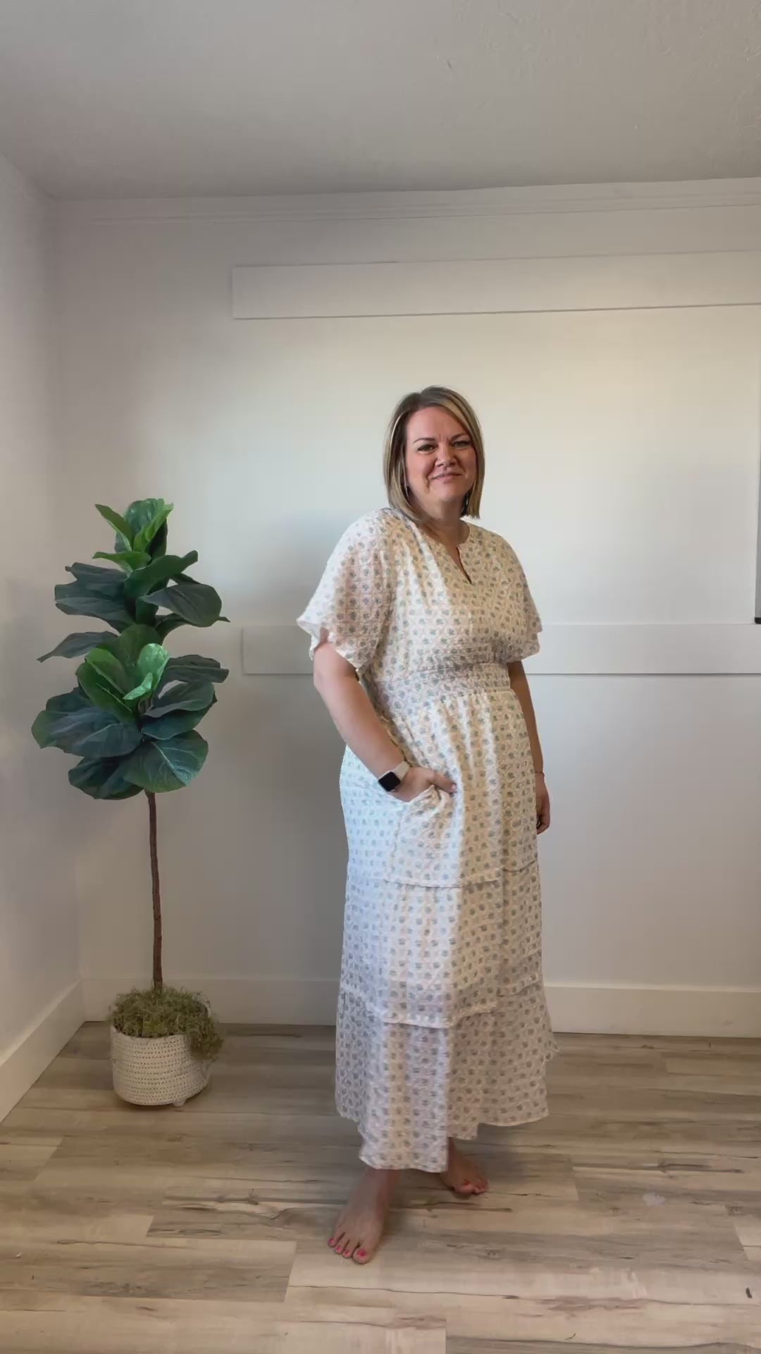 The Bexley Midi combines effortless style with thoughtful details. This charming dress features a split neckline and tiered silhouette that flatters every figure, while the elastic waist ensures all-day comfort. Soft pink and blue florals dance across a crinkle-textured fabric that moves beautifully with you. Practical seam pockets keep your essentials close, and the fully lined construction provides coverage and confidence. Perfect for occasions when you want to look polished without sacrificing comfort.