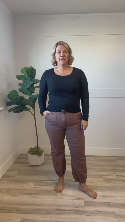 Slip into the Bobbi Jogger Pants for a perfect blend of laid-back charm and effortless comfort. These high-rise brown joggers feature soft fabric, a cozy elastic waist, and a playful drawstring for a snug fit. With traditional button and zip closure plus handy patch pockets, they’re as practical as they are stylish—ready for everything from lounging to running errands with a wink and a smile.
